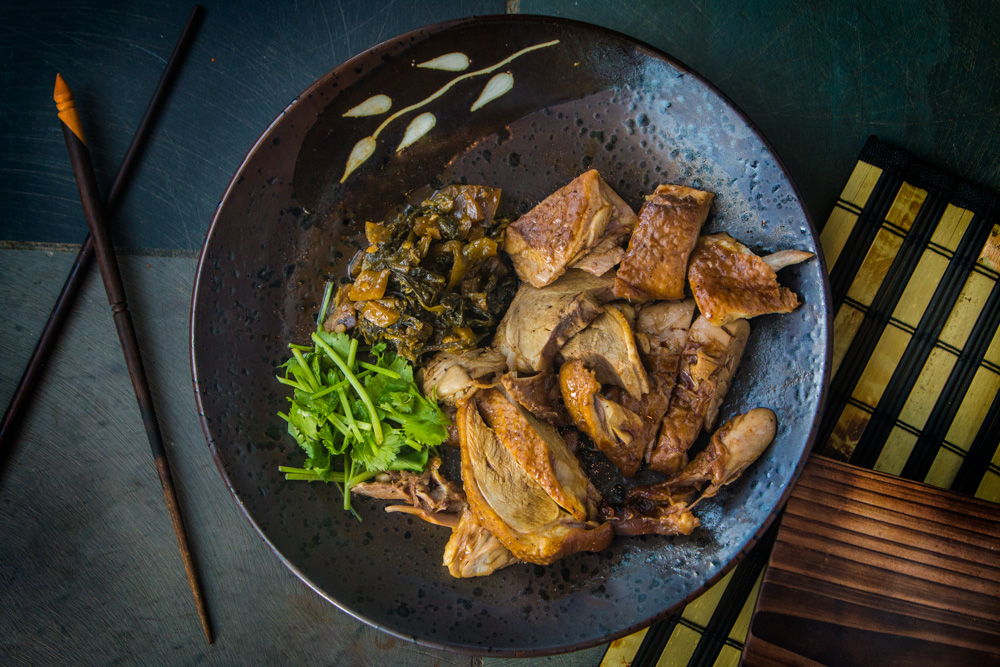 ground the imagery incorporating their tones and textures to complement the dishes. The grey-blue tones setoff the browns and vibrant greens of the food. The supporting elements within the composition helped maintain the Asian aesthetics while presenting the dishes in a fresh, unique way that stands out from the typical Asian restaurant photography.